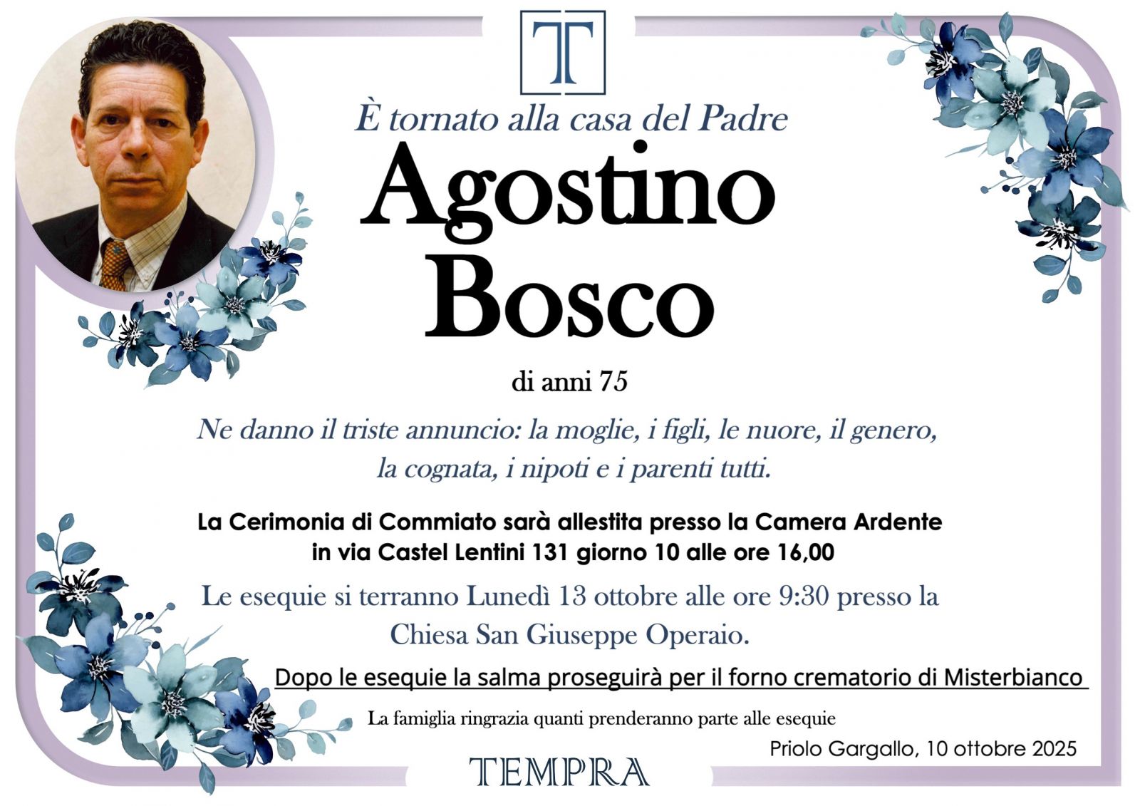 Lascia gratuitamente un messaggio di cordoglio, sarà nostra cura consegnarlo ai congiunti di Agostino Bosco.