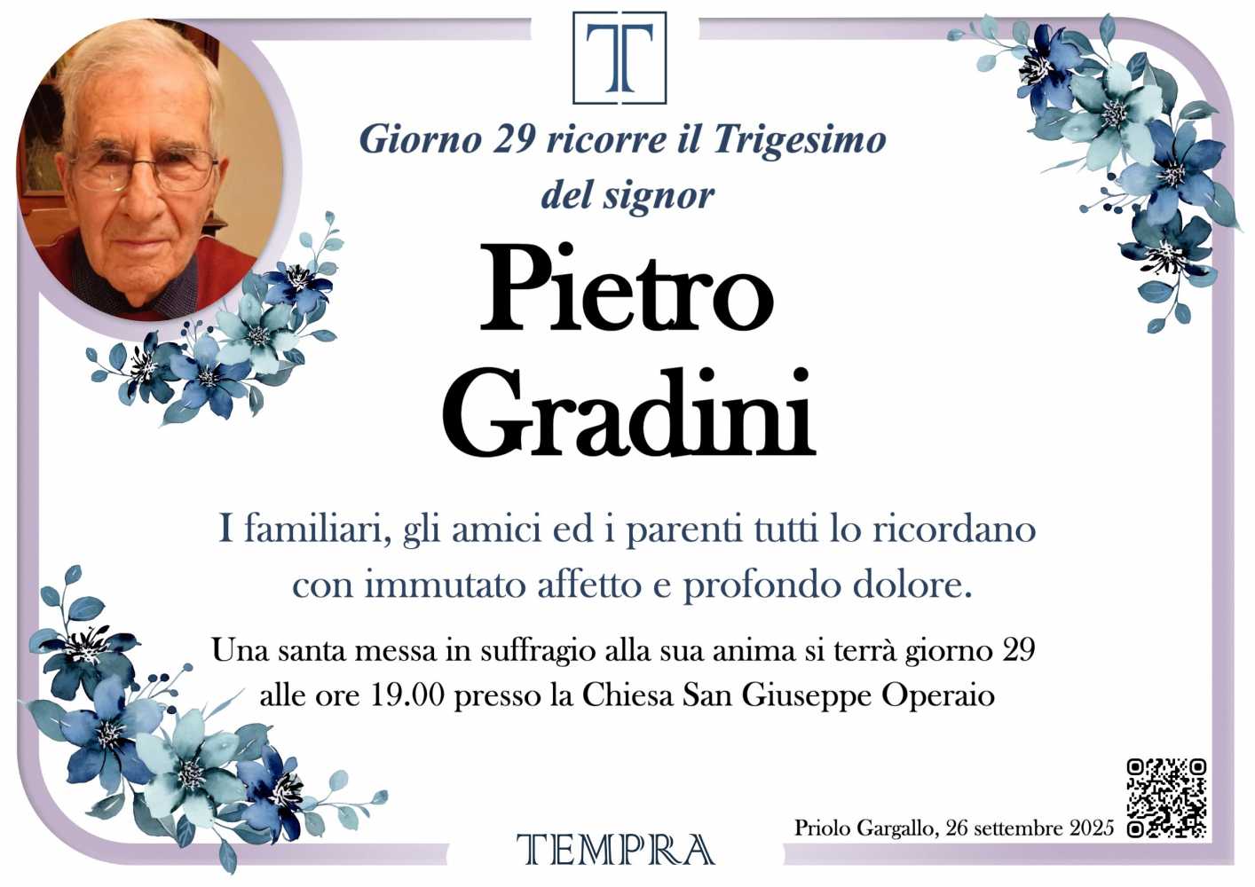 Lascia gratuitamente un messaggio di cordoglio, sarà nostra cura consegnarlo ai congiunti di Pietro Gradini.